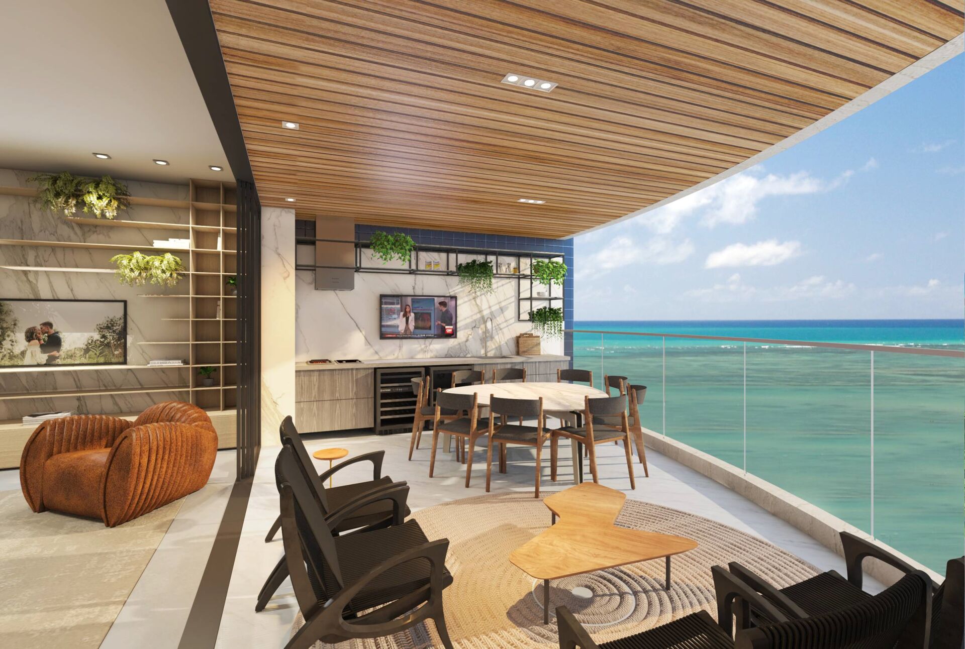 TORRE SAINT TROPEZ - São apartamentos na torre de trás com vista mar com 227 m² de área útil composto com varanda gourmet com 25 m², ampla sala de estar e jantar, lavabo, hall íntimo com home office e ligação interna com a cozinha, 4 amplas suítes independentes, sendo 1 máster, ampla cozinha que você pode integrar com a sala de jantar, área de serviço, DCE, espaço varadouro, 5 vagas de garagem no subsolo sendo 1 king com 3m x 5.5m, pontos de Split na sala e nos quartos, depósito individual com 3 m² no subsolo.