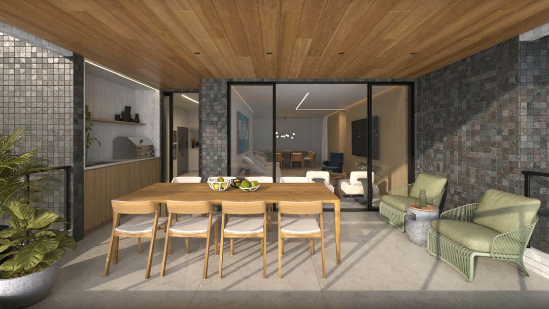 PLANTA 4 SUÍTES LATERAIS TERMINAÇÕES 03 E 04 - São apartamentos de meio laterais norte e sul com 202 e 208 m² de área útil composto com varanda gourmet com 19 m² com ligação com a cozinha, sala de estar e jantar, lavabo, hall de circulação com rouparia, 4 suítes independentes, sendo 1 máster com 29 m² com espaço para closet, cozinha, área de serviço e varadouro, DCE, 3 vagas de garagem sendo 1 com tomada para carro elétrico, 1 depósito por apartamento, pontos de Split na sala e nos quartos, piso em porcelanato, fechadura digital na porta social, infraestrutura para automação.