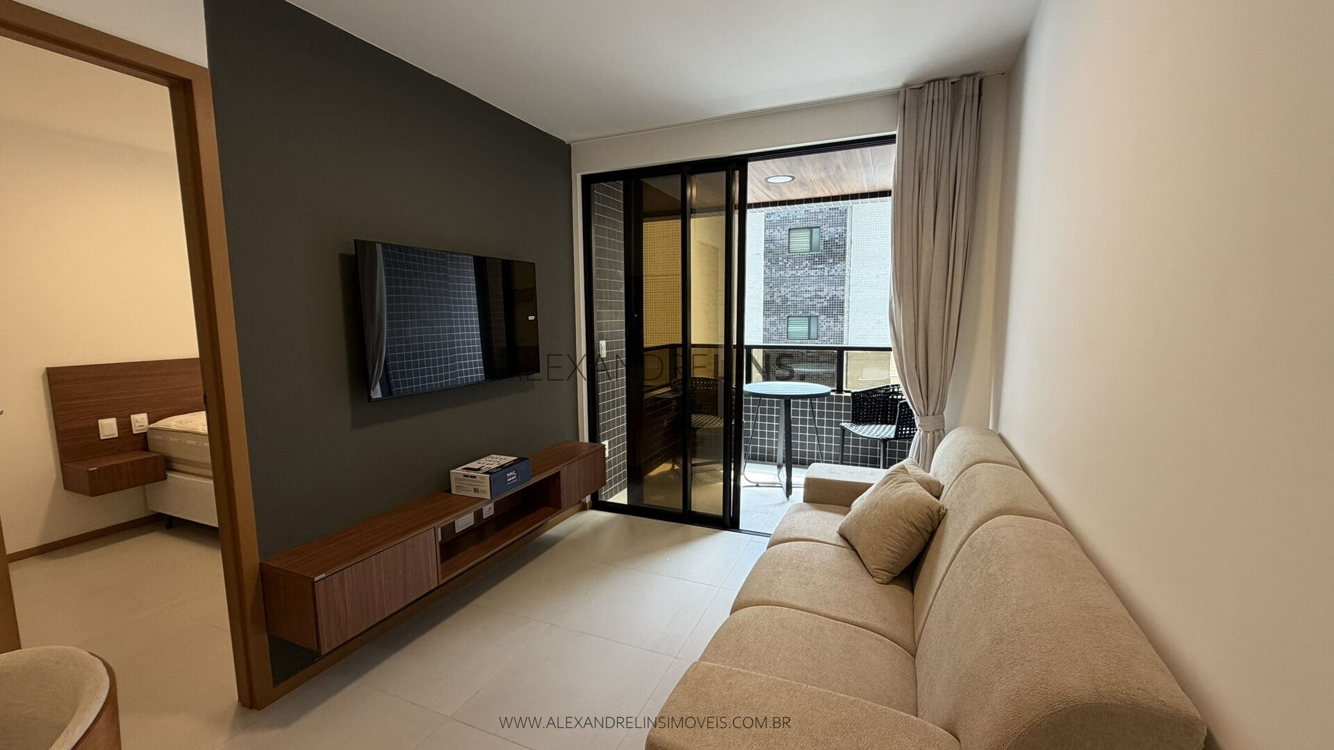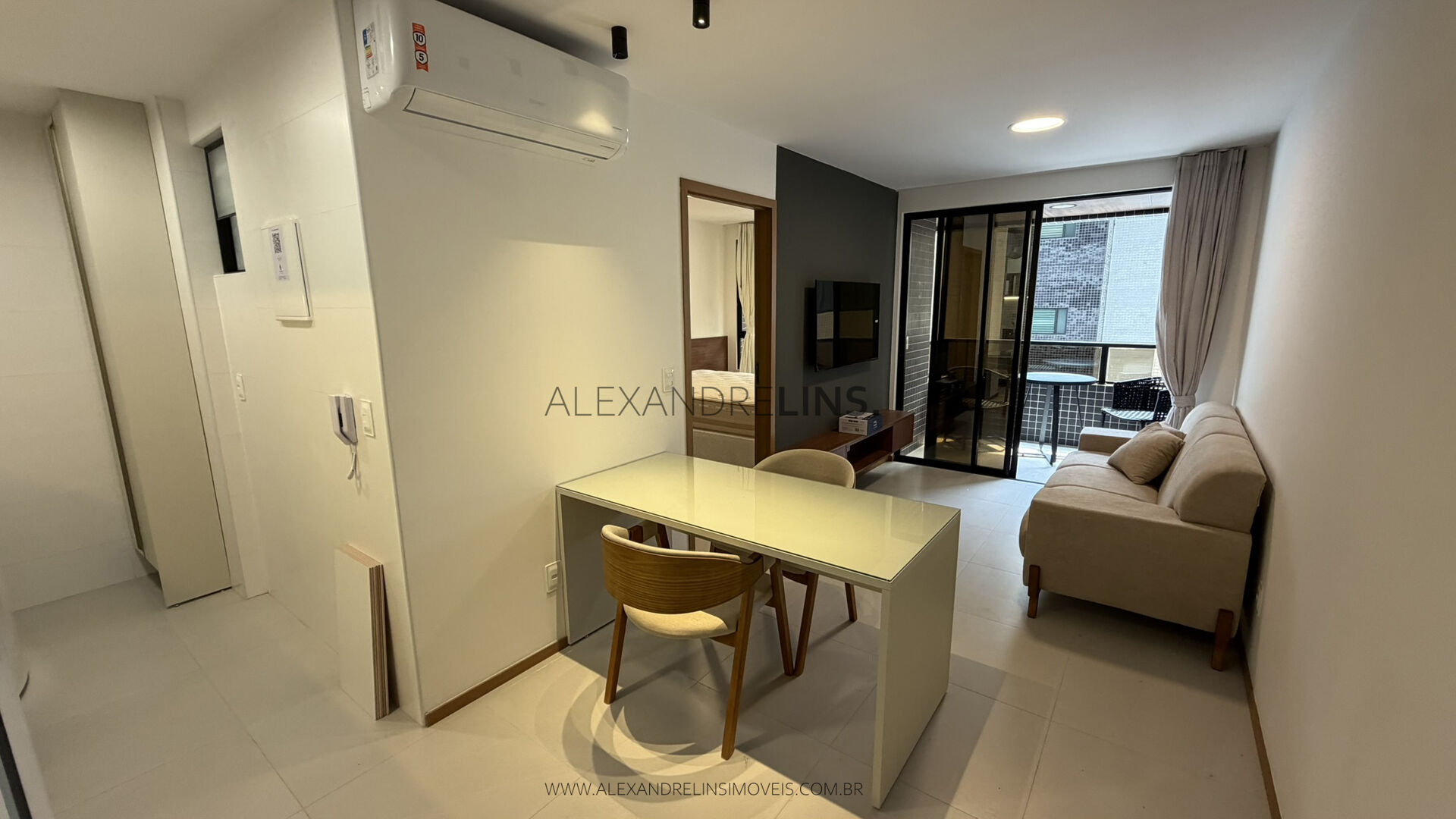Apartamento quarto sala novo e mobiliado com sala de estar e jantar, varanda, 1 suíte, cozinha, área de serviço, 1 vaga de garagem, apartamentos com 43 m² de área útil, SPLIT na sala e no quarto, completo de armários planejados, piso em porcelanato e fechadura digital.