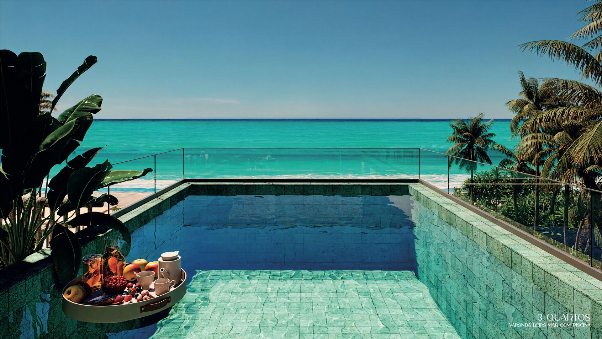 COBERTURA 3 SUÍTES FRENTE MAR - Cobertura Garden bloco Salsa com sala de estar e jantar integrada com a cozinha gourmet, ampla varanda gourmet com piscina privativa, 3 suítes, sendo 1 reversível com o WC social, área de serviço e WC de serviço, apartamento com 143 m² de área útil, 1 vaga de garagem fixa, piso em porcelanato 90x90.