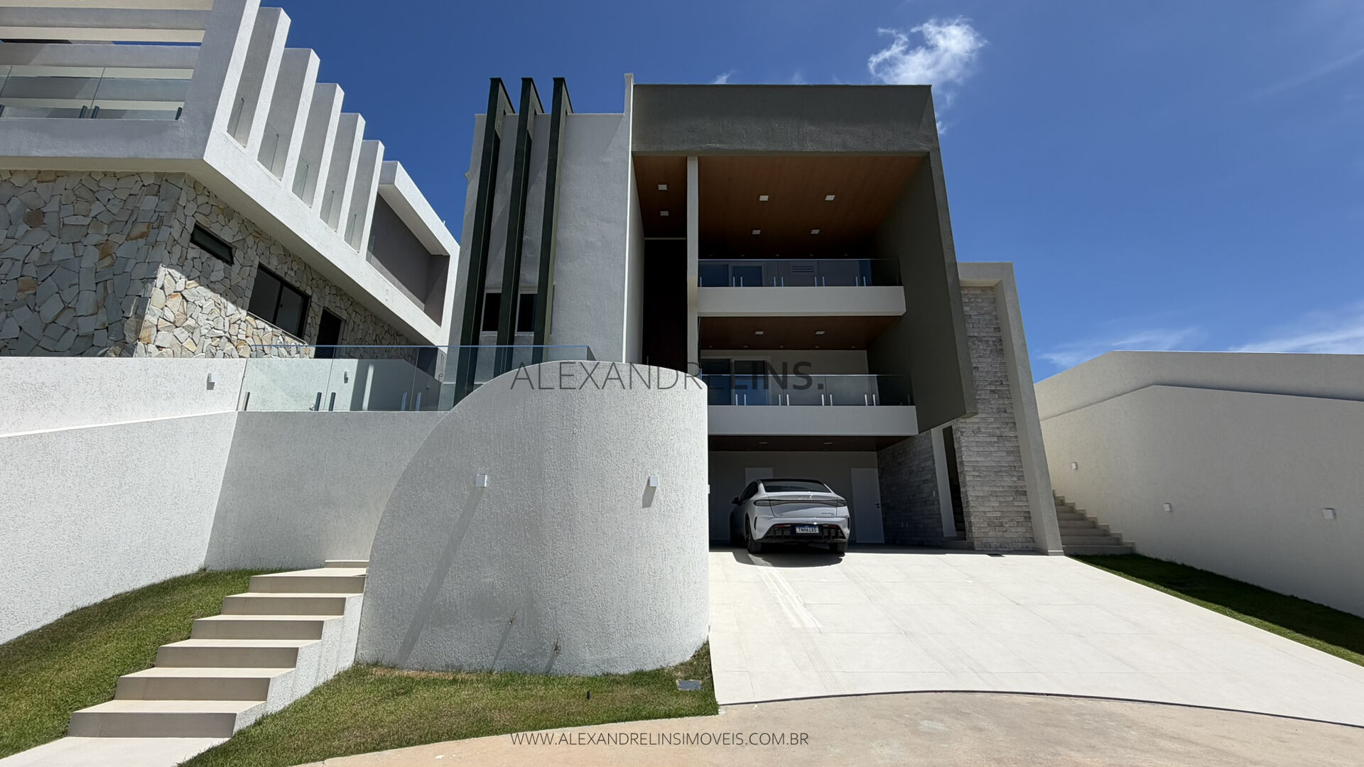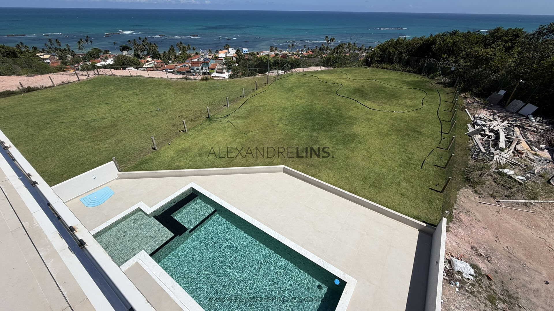 Uma mansão com 758 m² de área construída localizada em uma das melhores quadras do condomínio construída em 4 pavimentos sendo Pavimento inferior com moderno elevador com acesso ao primeiro e segundo pavimento, 4 vagas de garagem sendo 2 cobertas e 2 descobertas, 2 depósitos. Primeiro pavimento com hall de entrada, varanda, ampla sala de estar e jantar, gabinete, lavabo interno, amplo terraço com apoio gourmet com churrasqueira, lavabo externo, ampla área descoberta com deck e piscina com 60 m², ampla área de gramado, 1 suíte social, ampla cozinha com ilha e acesso ao terraço gourmet, despensa, área de serviço e DCE. Segundo pavimento com área de circulação, roupeiro, sala de TV, 2 suítes independentes espaço para closet, 1 suíte máster com espaço para closet, varanda e hidromassagem e 1 super suíte máster com mais de 50 m² com varanda, espaço para closet e banheiro com hidromassagem para 6 pessoas, 2 cubas e 2 chuveiros. Pavimento rooftop com 87 m² e vista de 180° permanente para o mar. Casa com excelente padrão de acabamento, piso em porcelanato, esquadrias em PVC e ambientes com pontos de Split.
