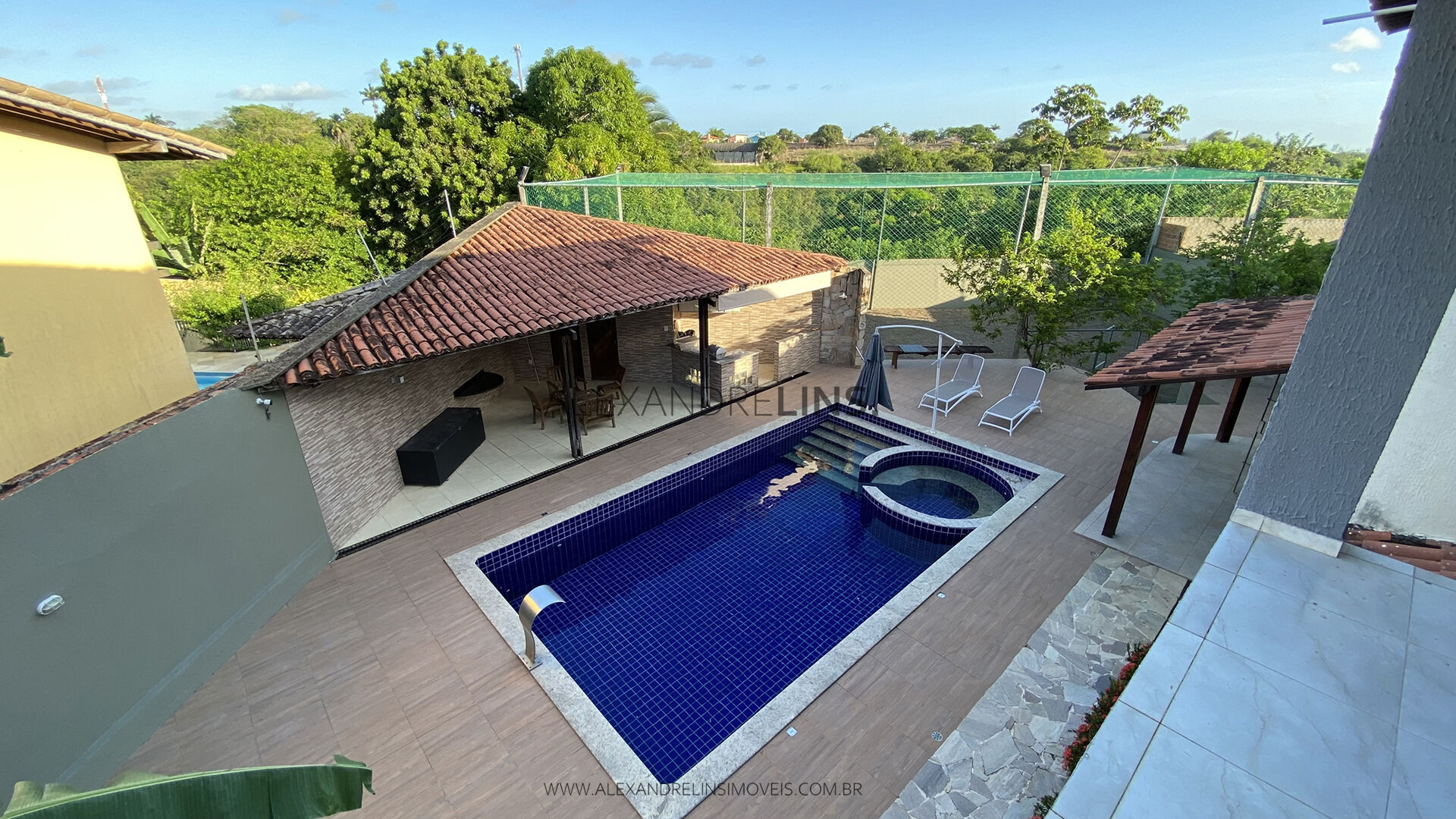 Uma excelente e ampla casa construída em 2 terrenos tendo no pavimento térreo um amplo espaço para jardim, excelente área de lazer com piscina com hidromassagem e iluminação em LED, amplo deck e apoio gourmet com churrasqueira e lavabo, amplo espaço para campo de futebol com tela e iluminação noturna, varanda, ampla sala de estar e jantar, sala de home theater ou podendo ser quarto social, 1 quarto social, WC social, cozinha com despensa, área de serviço, DCE, garagem coberta para 3 carros e mais 2 descobertas, pavimento superior com espaço para um estar íntimo, 3 suítes independentes, todas com varanda, sendo 1 máster com escritório, closet e hidromassagem. Casa toda solta e voltada para o nascente e super arejada, canil, completa de armários planejados, pontos de Split nos quartos, piso em porcelanato, casa com 400 m² de área construída e terreno com mais de 1000 m².